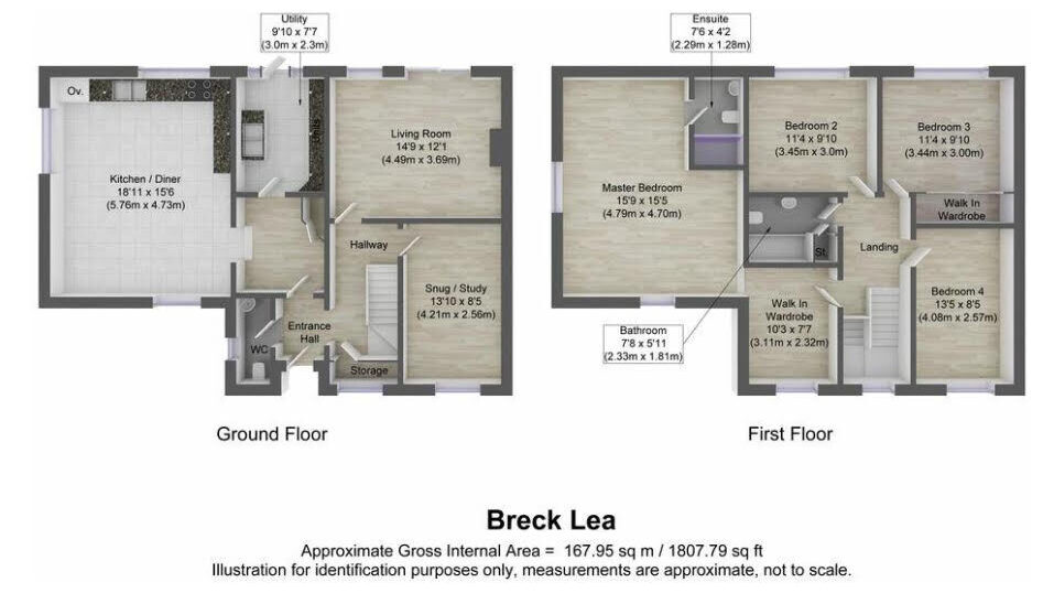 Room type Level Length Width Kitchen/Diner Ground Floor 5.76m 4,73m Living Room Ground Floor 4.49m 3.69m Utility Ground Floor 2.3m 3.0m Office/Snug Ground Floor 4.21m 2.56m Downstairs WC Ground Floor Master Bedroom First Floor 4.79m 4.7m Bedroom 2 First Floor 3.45m 3.0m Bedroom 3 First Floor 3,44m 3.0m Bedroom 4 First Floor 4.08m 2.57m