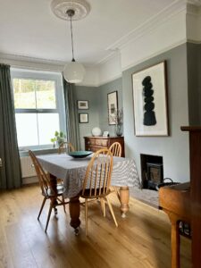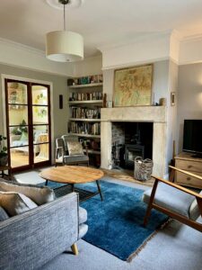 The ground floor flows beautifully into an impressive 23-foot living room, a room of real substance and character, centred around a stone-lined fire surround and enriched by striking Victorian architraves and decorative detailing. Both elegant and inviting, it offers the perfect setting for quiet evenings at home, relaxed family living and stylish entertaining alike.