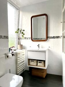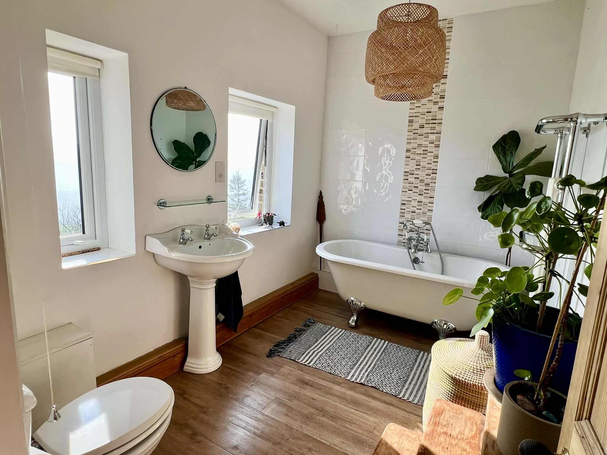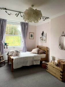 The principal bedroom is further enhanced by a stylish modern en-suite shower room, offering a sleek contemporary finish that complements the home’s period character. The main bathroom is equally impressive, with a freestanding roll-top bath creating a striking focal point, while a Victorian stained-glass panel in the door and a period-style suite add elegance, warmth and individuality.