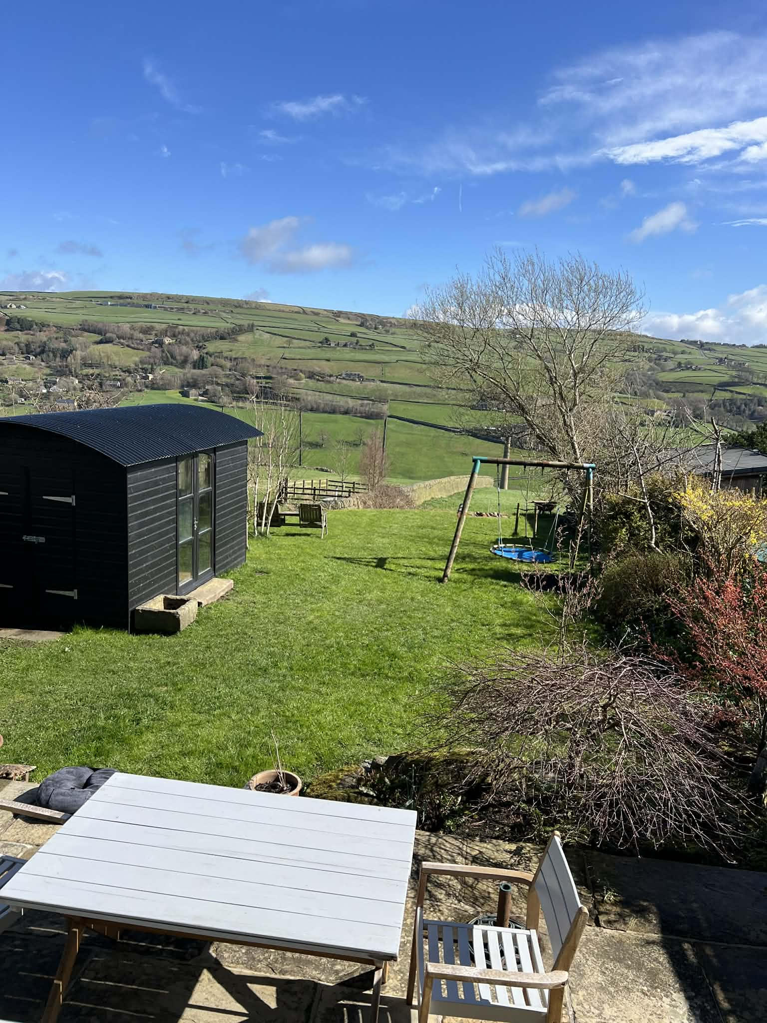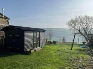 To the rear, the garden is generous in scale and thoughtfully arranged to make the most of the breathtaking long-distance views. A patio provides the perfect space for outdoor dining and summer entertaining, while the expansive lawn creates a superb area for relaxation and family life. A useful shed and a newly built garden room add further practicality and versatility, whether used as a playroom, studio, home office or peaceful retreat.