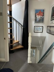 A winding staircase rises from the landing to the attic floor, where two full-width rooms provide exceptional flexibility. Currently arranged as a workshop and an additional bedroom, complete with wooden cladding and useful eaves storage, these rooms lend themselves beautifully to guest accommodation, hobbies, creative work or home office space.